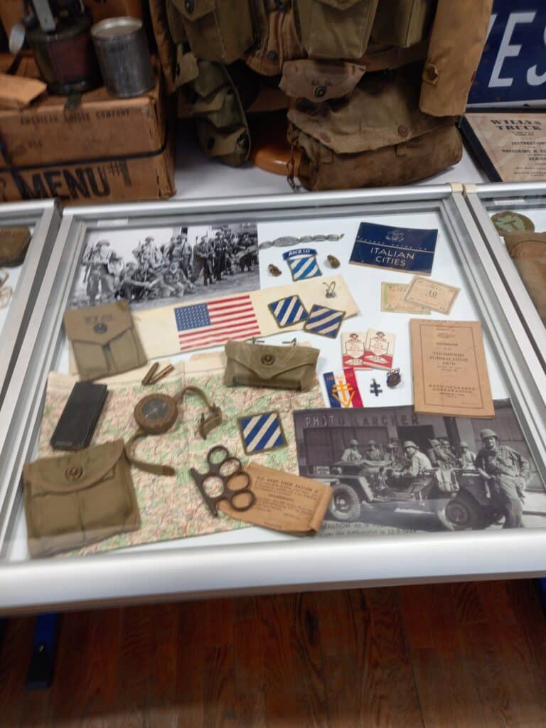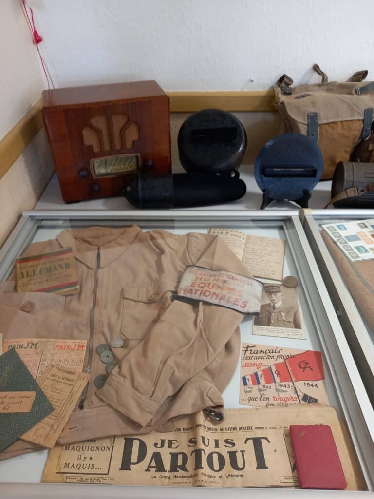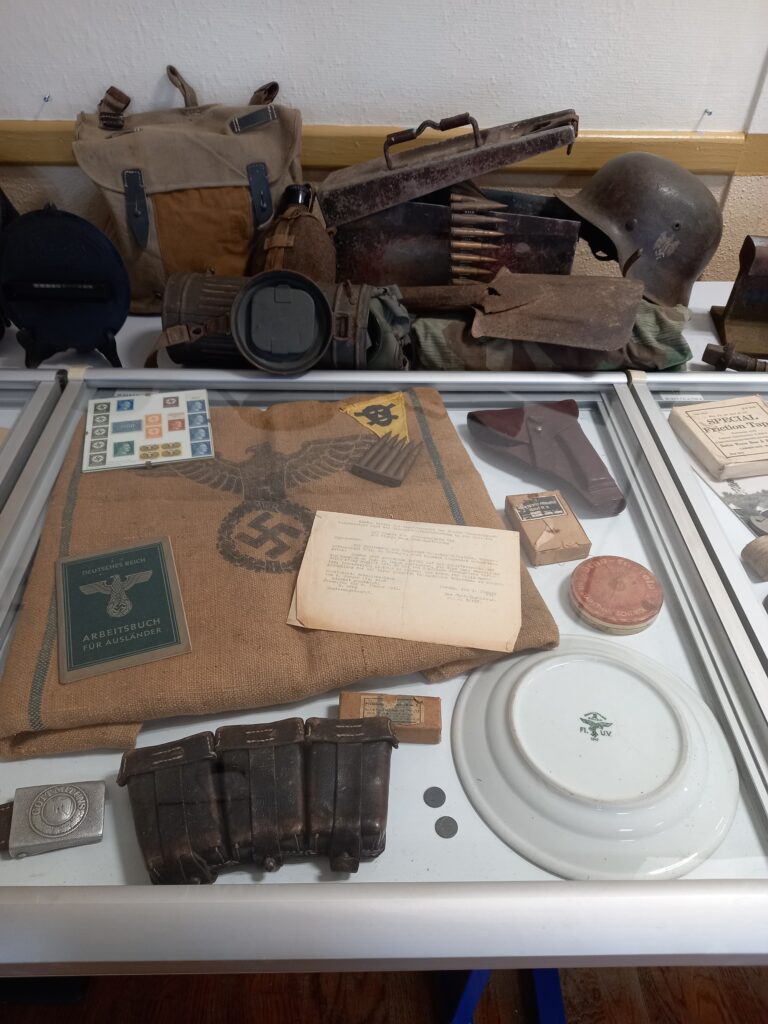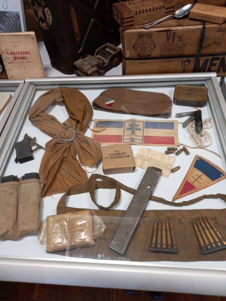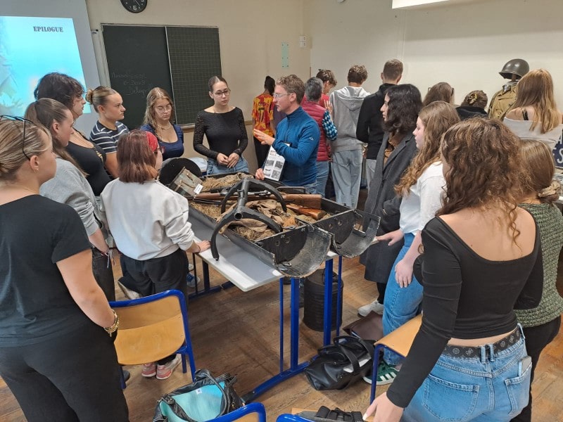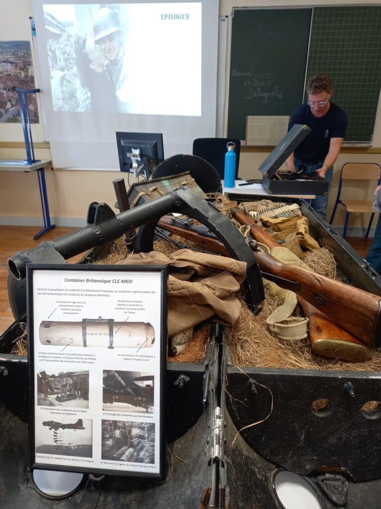 La conférence s’est déroulée en deux temps : Simon a d’abord rappelé le contexte historique qui a provoqué la guerre puis il s’est appuyé sur l’histoire locale à Vesoul et en Haute-Saône afin de montrer que notre département n’a pas été épargné. Ensuite les élèves se sont déplacés dans la salle de classe (métamorphosée pour l’occasion en véritable petit musée) afin de voir de près les objets exposés et poser toutes les questions qu’ils /elles voulaient aux intervenants. La curiosité des élèves était palpable autour des vitrines (organisées par thème : la France occupée, le soldat allemand, le soldat américain, la résistance…) et du contenair de parachutage. Cette collection est le résultat de vingt ans de recherche auprès des habitants de Haute-Saône, dans des ventes aux enchères, des vides-greniers, des brocantes, des bourses de collectionneurs,… Certains élèves ont aussi partagé leur histoire personnelle liée à cette période avec Simon.