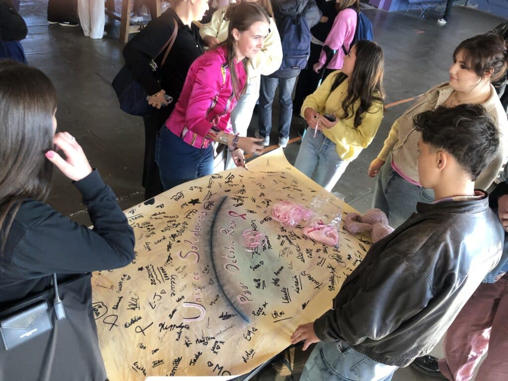 Sur le sein amputé, les élèves du CVL ont invité toutes les personnes souhaitant témoigner leur soutien à apposer leur signature. Jour après jour, la fresque s’est remplie, devenant un véritable mur de solidarité.