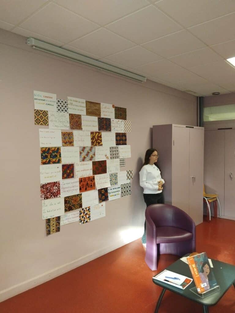 À l’occasion de cette rencontre, les élèves ont eu l’occasion de se plonger dans l’univers de la bande dessinée tout en explorant les motifs et le symbolisme du wax. Ils ont d’abord réalisé un patchwork de motifs wax, une activité créative qui leur a permis de s’approprier l’esthétique de la BD tout en proposant leur propre interprétation. Chaque élève a illustré son motif par un haïku, ajoutant une dimension poétique à son travail. Ils ont également conçu des marque-pages inspirés de l’univers graphique de Wax Paradoxe, en réinterprétant les motifs du tissu et en les associant à des éléments de la culture africaine.