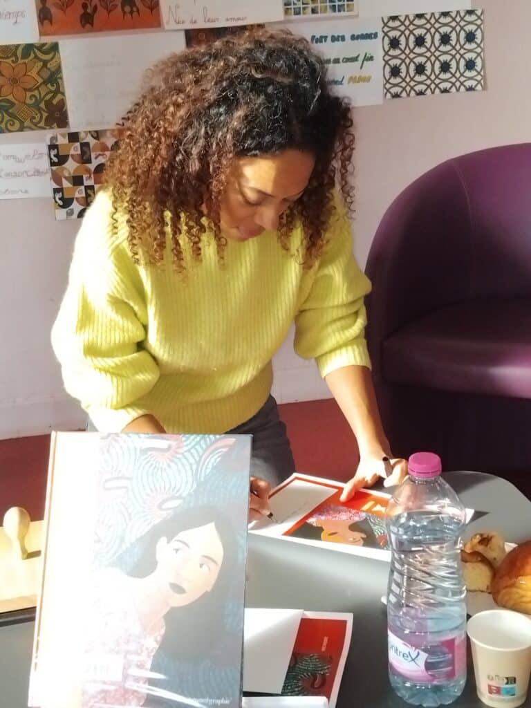 La rencontre s’est terminée par un moment d’échanges entre Justine Sow et les élèves, suivi d’une séance de dédicace, au cours de laquelle les élèves ont pu poser leurs questions à l’auteure. Justine Sow a présenté également un panel de tissus et nous a appris à déceler le vrai du faux wax.
